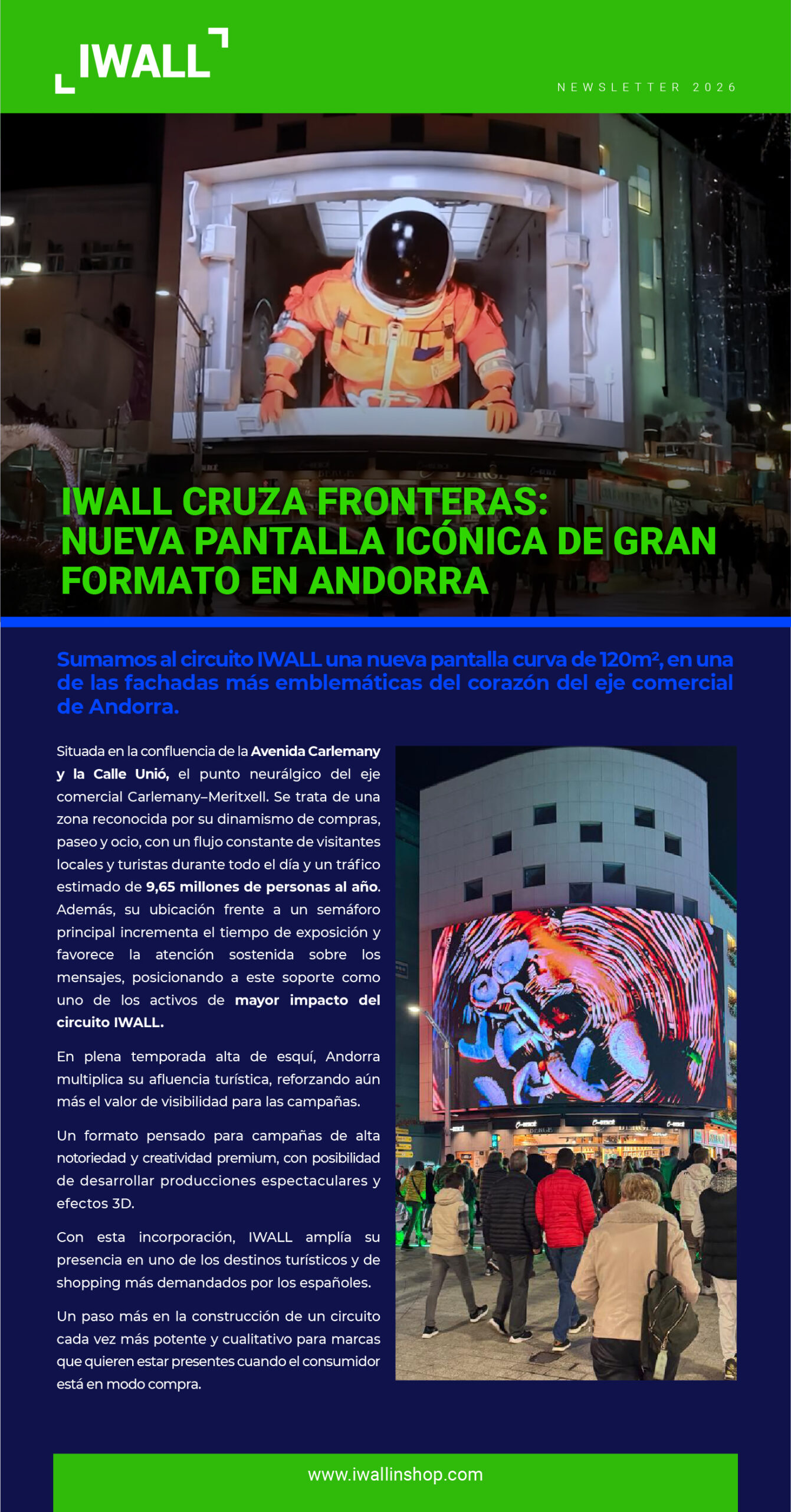 La pantalla, situada en una de las ubicaciones más emblemáticas del eje comercial de Andorra y con un tráfico estimado de 9,65 millones de personas al año, se posiciona como uno de los activos de mayor impacto del circuito IWALL.