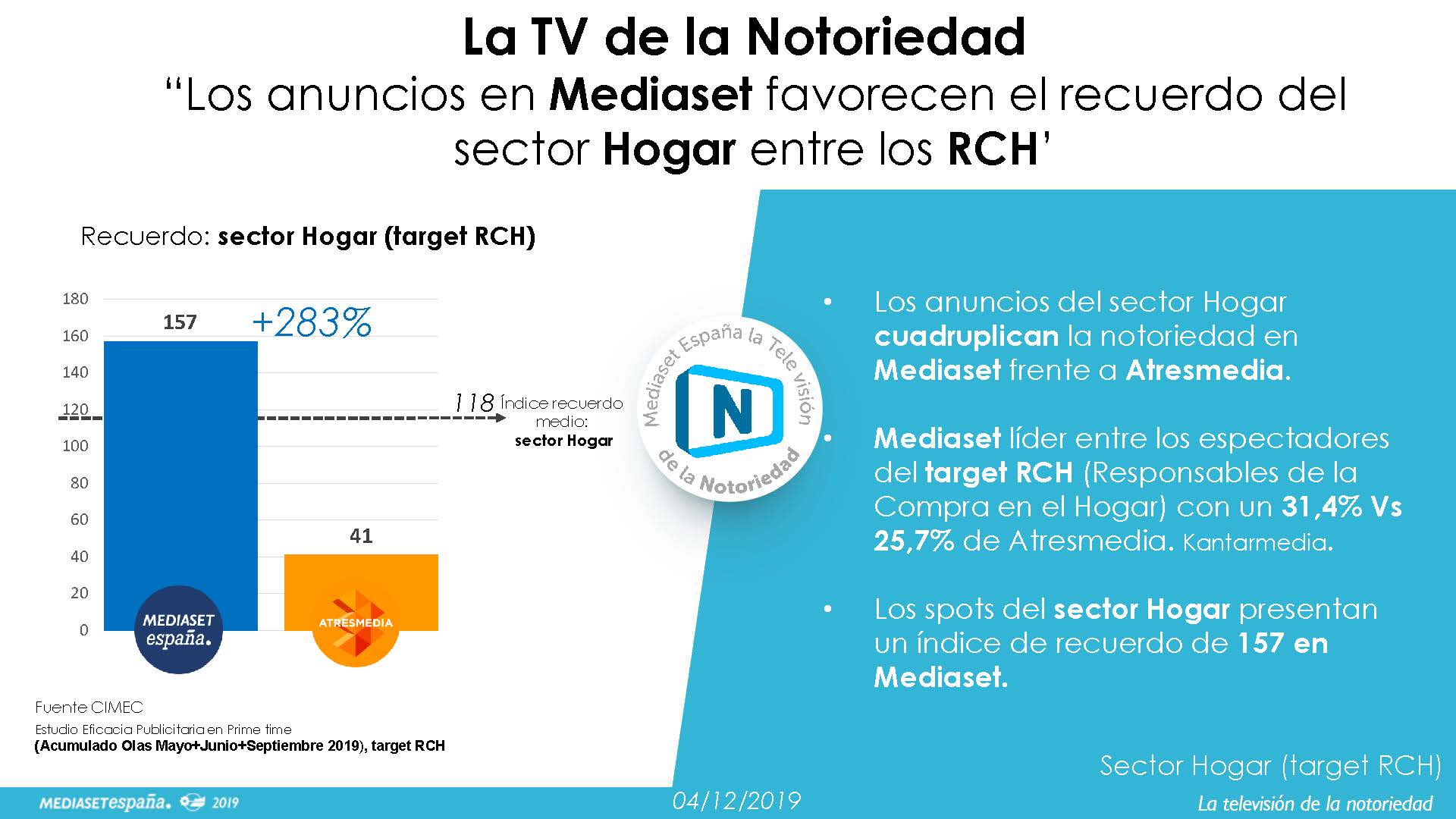 • Los datos acumulados de las Olas de los meses de Mayo, Junio y Septiembre de 2019 del Tracking de Notoriedad Publicitaria realizado por el Instituto CIMEC, demuestran que los spots del sector Hogar se recuerdan casi cuatro veces más en Mediaset que en Atresmedia entre los Responsables de la Compra en el Hogar (RCH).