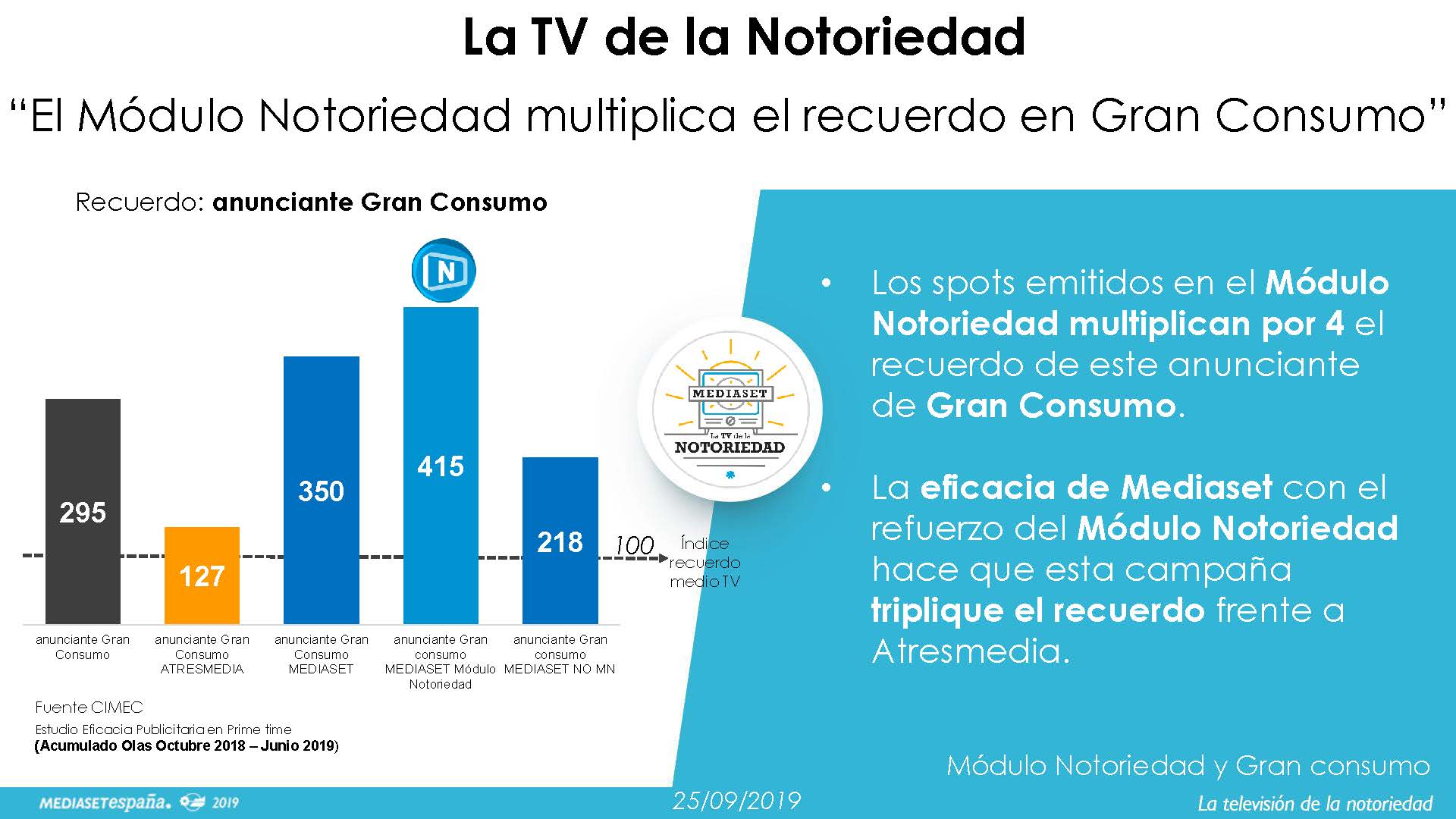 La eficacia de Mediaset con el refuerzo del Módulo Notoriedad hace que estas campañas tripliquen el recuerdo frente a Atresmedia, en este sentido el índice de recuerdo de este anunciante de Gran consumo en Mediaset es de 350 frente al 127 en Atresmedia.